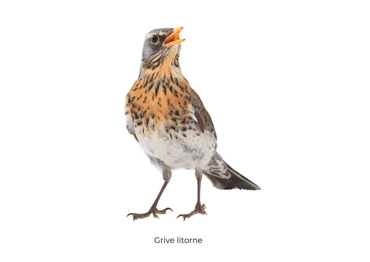 La Grive litorne : de taille du Merle, intermédiaire entre la Draine et la Musicienne, la Litorne diffère de ses consœurs par des teintes plus contrastées avec le dos brun roux et les ailes brunes, alors que tête, nuque et croupion sont gris cendré et la poitrine brun orange avec des taches de forme effilée. Et aussi par un caractère sociable bien plus affirmé qui permet aux couples de s’agréger en petite colonies. Un mode de comportement qui assure une meilleure défense contre les prédateurs, surtout que la Litorne préfère s’établir dans des endroits bien dégagés plutôt que dans les boisements compacts. Dès qu’un rapace ou même une Corneille fait mine de s’approcher, l’intrus est aussitôt pris en chasse par derrière par les membres de la colonie qui manifestent leur courroux avec force vociférations tout en accompagnant si besoin leur attaque par des jets de déjections ! De nature, les colonies de Litornes sont très bruyantes et leur jacassement de pie audibles de loin. Si bien que le chant, plutôt ingrat, aux sonorités disparates n’a nul besoin ici d’affirmer une territorialité.