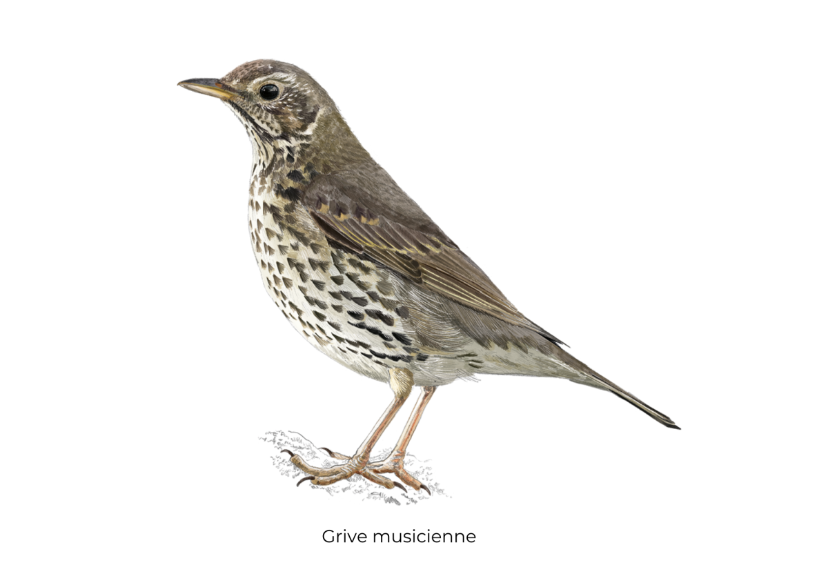 La Grive musicienne : livrée semblable à la Draine, avec un brun plus chaud et des taches ventrales en ‘v’ plutôt que de forme arrondie. De taille nettement plus petite, elle patientera jusqu’à la fin de l’hiver pour lancer urbi et orbi ses strophes sonores, puissantes répétitives et saccadées qui viennent résonner tel un hymne à la joie, à l’adresse de la lumière et du réveil de la nature ! Une allégresse si débordante, si pleine de verve et d’ivresse qu’elle s’apparente à une célébration, une forme d’éloge à toute la création !